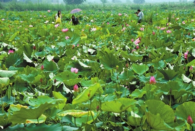 26日,嘉鱼县渡普镇大路铺村,游客正在观赏荷花,成片的荷田里,莲花争艳,莲蓬饱满,一派喜人的丰收景象。据了解,该镇推广的太空湘莲品种莲蓬盘面大,颗粒饱满,莲子亩产量可达120公斤左右,预计全镇总产量将达800余吨。