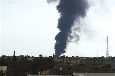 7月28日,利比亚的黎波里国际机场激战持续,一油库被火箭弹击中起火,大火已经蔓延到了第二个储油罐。据悉,因政府军与民间武装持续一周的战斗,已有97人被打死,400多人受伤。(据新华社)