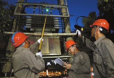 7月30日晚,市供电公司工作人员在咸安区潜山路进行变压器带电测试温度,确保安全稳定供电。 通讯员 詹文峰摄