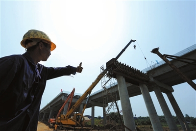7月31日,斧头湖特大桥施工现场,工人们正在吊装桥梁。