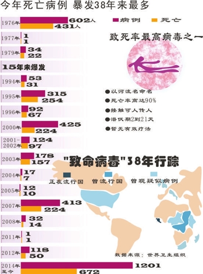 美国疾病控制和预防中心的统计数字显示,几内亚、利比里亚和塞拉利昂共出现1201起感染病例,672人死于埃博拉出血热。