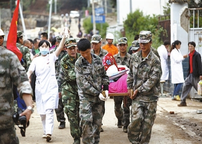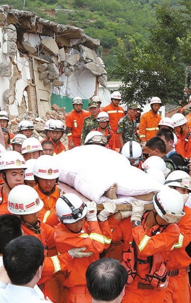 8月4日,在云南鲁甸地震震中龙头山镇,救援人员在抢救伤员。目前,救援人员抢抓震后72小时黄金救援期,全力搜救生还者。