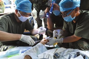“病人必须住院手术。”龚玉斌为伤员叶顺兴进行了简单的包扎,并及时输液。其他官兵开始制作简易担架,小心翼翼地将叶顺兴挪到担架上,准备运送到7公里外的医疗点进行救治。