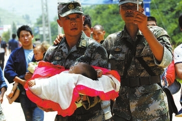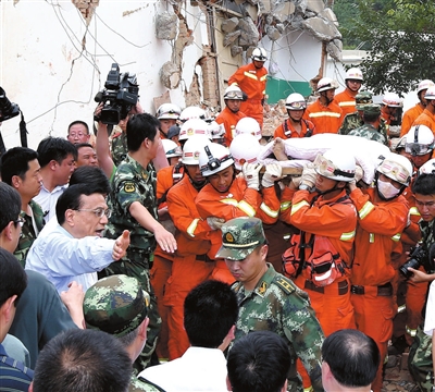 身着红色、写有“中国救援”字样衣服的国家救援队,经过6个小时的不懈奋战,于5日12时45分在龙头山镇龙泉村废墟中挖出一名10岁小男孩;云南公安消防总队特勤支队战士用手刨出一名5岁男童……