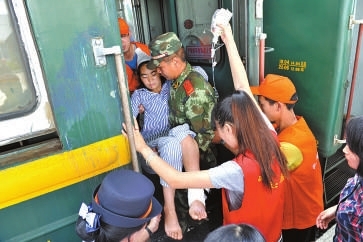 “背也要把受伤群众背出大山!”武警交通三支队二大队21名官兵冒着生死危险,手脚并用地挺进“死亡谷”——鲁甸县火德红乡王家村,经过7小时的鏖战,终于把32名重伤员和200多名群众转移到安全地带。当把87岁的陈阿婆送上救护车后,工程师李清疲惫瘫软在地上。