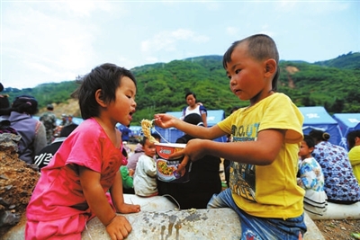 “那辆车上可以领盒饭,快啊!”在距离震中龙头山镇3公里的加油站,正当村民在到处寻找水和食物时,人群中有人大叫了一句。鲁甸县城一家餐馆用一辆皮卡车拉着两箱盒饭正在发放给村民。