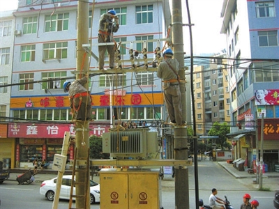 7月31日,城犀线硅厂2号台区施工现场,供电人员在近40℃的“烤”验下作业。为确保迎峰度夏期间正常用电,通山县供电公司升级改造辖区内的配电网用电设备,完成6个台区的增容布点工作,确保上千户居民清凉度夏。 通讯员 艾丽丝摄
