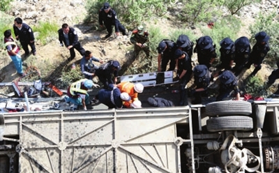 记者9日下午在事故现场看到,事故发生路段位于雅鲁藏布江边的山谷地带,旅游大巴车在撞击后坠入路边深达10余米的悬崖下、雅鲁藏布江边,车轮朝天,车体严重变形。由武警、公安消防、医务等人员组成的救援队伍携带救援设备,第一时间赶到事故现场奋力抢险救人。但是,由于载人最多的大巴车翻落在陡崖下、雅鲁藏布江边,地形复杂,救援难度很大。