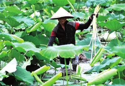 8日,嘉鱼县陆溪镇官洲4组,村民刘落成正在自家湖塘采抽藕带,今年他种的10多亩藕带已卖了3万多元。目前,全镇发展藕带1000余亩,增加农民收入达400万元。