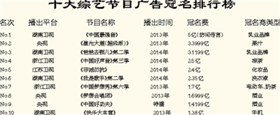而综艺节目的广告油水到底有多丰厚呢?一组来自广告界的数字说明一切。一直以来,乳业公司是综艺广告投放大户。根据公开资料,伊利、蒙牛、光明三大乳企2013年上半年的广告费合计达到40.91亿元。