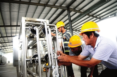 8月7日,国内首家生产风味红薯类饮料企业——崇阳县故乡云生物科技有限公司员工在调试生产设备。