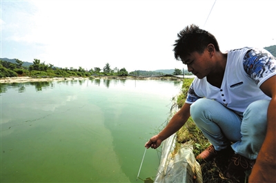 15日,在赤壁市官塘驿镇龙凤山村5组,余伟清正在鱼塘测量水温,按水温来决定投放饵料的量。余伟清今年28岁,两年前他在外贩卖泥鳅时发现,泥鳅市场缺口大,有前景。去年,他回乡投资50多万元承包了20亩水塘,购回800万尾泥鳅苗。在专家的指导下,目前泥鳅长势良好,再过两个月便可以上市。