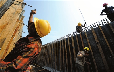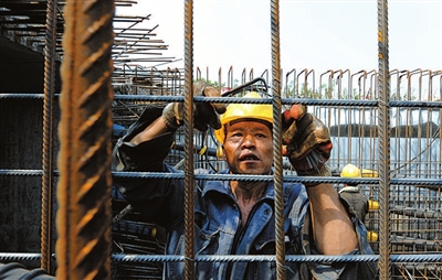 来自四川筠连县的双胞胎兄弟胡守文、胡守忠正在工地的钢筋车间扎钢筋。他们哥俩是工地上的熟手了,干了10多年的钢筋工。