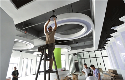 15日,在赤壁市绿购网,工人们正在办公点安装灯饰。绿购网是中国绿色生态产业展览交易基地旗下的电子商务平台,目前已通过阿里巴巴运营服务商认证,淘宝湖北馆咸宁频道、一号店咸宁特产馆、淘宝大学武汉商学院赤壁分院(咸宁)也即将落户绿购网。据悉,绿购网预计9月初试运营,届时,赤壁和咸宁周边的绿色食品将在网上走向全国。