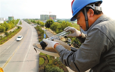 8月15日,供电人员在嘉鱼县发展大道上,对新安装的节能型路灯进行调试。今年来,市供电公司对各个县市区主干道路灯进行改造,近千盏节能型路灯即将启用。这些路灯均采用绿色环保灯型,不仅节省电量45%以上,还能消减频闪所致的光污染。