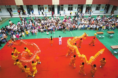 8月29日,在合肥市少儿艺术学校,学生们在新学期文艺演出上表演舞龙舞狮。