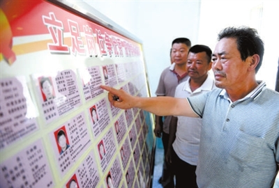 8月底,赤壁市赵李桥镇蓼坪村民在查看“两委”成员履职情况。该市率先启动蓼坪村换届选举工作,将现任村“两委”班子履职情况全部公开,接受村民监督,同时明确换届选举“十条禁令”,确保选好、选准农村致富带头人。 记者 袁灿 通讯员 叶国平 摄