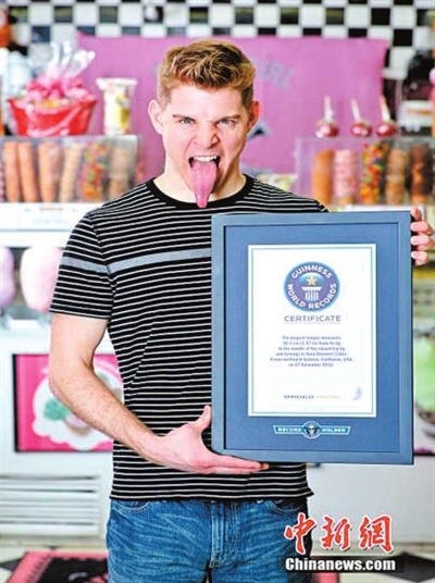 这项纪录保持者是来自加利福尼亚的24岁的NickStoeberl。他的舌头经测量长达10.1厘米。当Nick还是孩子时就曾模仿GeneSimmons的舌头秀,那是他第一次意识到自己的舌头比一般人长很多。生活中他享受这长舌头所带来的关注:“我不仅能舔到我的鼻子,还能舔到肘部!