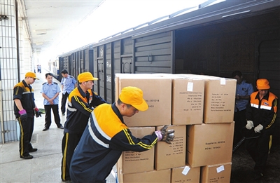 17日,“九州货物快运”首列鄂东南环列车到达咸宁,工作人员在装卸货物。