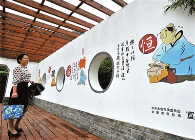 16日,赤壁市行政服务中心路段,市民从画有传统美德的文化墙旁走过。