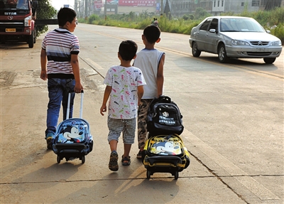 16日,十六潭路东路段,放学的孩子拉着儿童滑轮拉杆减负书包回家。学生书包过重容易造成孩子长得慢、缩得快,商家给书包装上拉杆,来减轻孩子“肩头担子”,拉杆书包正成为一种校园流行。 记者 陈红菊摄