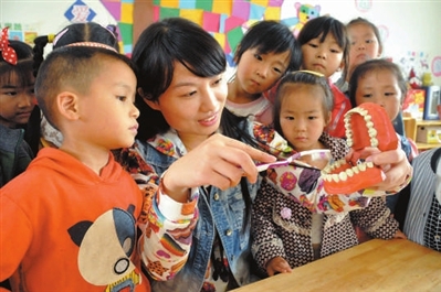 昨日,江苏东海县农开项目区幼儿园老师向孩子们讲解爱牙知识。为迎接9月20日“全国爱牙日”的到来,全国各地的学校、幼儿园纷纷举行以“健康每一天,从爱牙开始”为主题的爱牙日活动,引导孩子们学习健康的爱牙、护牙知识,从小树立爱护牙齿、保护口腔健康的良好意识。 据新华社
