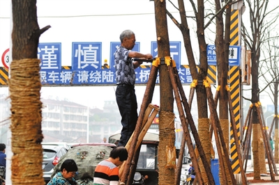 16日,赤壁市金鸡山路,工人们正为改造人行道忙碌。据了解,为改善该路段人行道破损难行的现状,赤壁市市政和园林局共同启动人行道改造项目,投入资金70余万元,铺设火烧板,改种樟树,预计“十一”前可完工,市民出行将更安全。记者 夏正锋 通讯员 张杰摄
