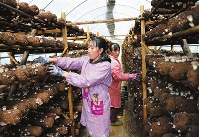 昨日,两名当地农村妇女在食用菌智能化标准菇棚采摘香菇。