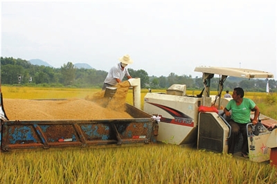 昨日,通城县关刀镇新畈千亩水稻高产创建示范基地,收割机吐着金谷。该县20多万亩中晚稻喜获丰收,亩产量700多公斤,亩增收百斤。 特约记者 刘健平 摄