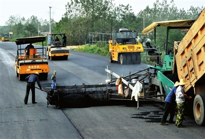 ▲10月1日,武咸快速通道路面刷黑现场,工人们放弃节假日加班施工抢进度。据了解,继去年完成7.5公里城区段路面工程之后,目前市安达养护工程有限公司正对武咸快速通道横沟段12公里路面展开施工。记者 夏正锋 通讯员 李君摄