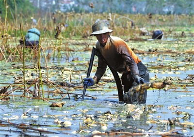 9日,在赤壁市柳山湖镇水生蔬菜基地,农民正在开挖新藕。