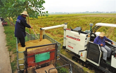 中稻丰收,国庆前后,鄂南大地随处可见机械收割的场景,农民脸上露出丰收的喜悦。 市农业局工作人员介绍,预计中稻一个星期收割完毕,一季晚稻很快将进入收割期。 记者 陈红菊摄