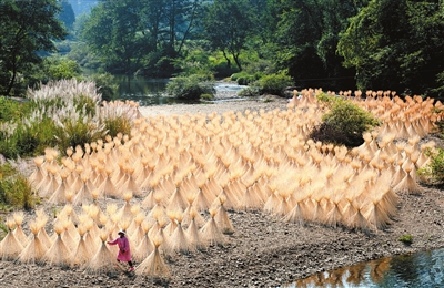 14日,天气晴好,崇阳县港口乡汪锦璇竹子加工厂的工人忙着晾晒半成品筷子。