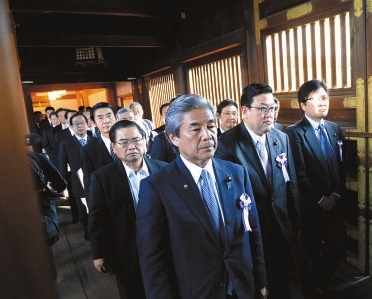 昨日,由日本国会议员组成的“大家都来参拜靖国神社国会议员之会”集体参拜了靖国神社,其中亲自到场的有110人。当日,日本首相安倍晋三向靖国神社供奉了祭品。 据新华社