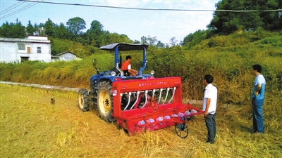 昨日,通城县北港镇庄前社区杨柳畈油菜示范基地,油菜直播机正在深松整地后的田地上播种、施肥。眼下,通城县正抢抓秋播农时,种植小麦、油菜等,为来年丰收打牢基础。 通讯员 吴宇星 摄