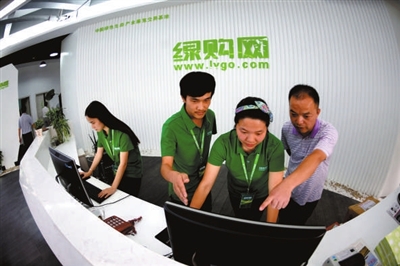 15日,赤壁绿购电子商务公司员工在指导客户购买商品。该公司是由赤壁市和湖北三国鼎盛网络传媒有限公司组建的新型混合制企业。公司与阿里巴巴、淘宝、京东等电商平台搭建多个合作渠道,将赤壁及咸宁周边的绿色食品在网上销往全国。记者 袁灿 摄