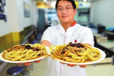 昨日,杨洋在展示自己店里制作的酿皮。1984年出生的杨洋曾在俄罗斯学习、工作和生活了11年,2012年底,他回到兰州,将卖酿皮和甜醅子等兰州特色小吃作为自己的创业方向。创业几个月来,小吃店一天能收入六七千元,已经有了不少回头客。 据新华社