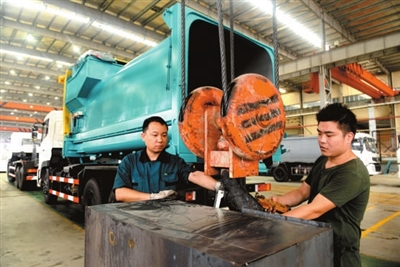 13日,湖北合加环境设备有限公司技术员准备吊装汽车环卫设备。该公司位于市经济开发区,由桑德环境资源股份有限公司投资3.8亿元建设,主要生产现代化环境资源设备和专用车研发、设计及制造。公司分二期建设,目前一期已建成投产,预计年产环卫车辆及设备3000台套,实现销售收入4.7亿元。记者 袁灿 摄