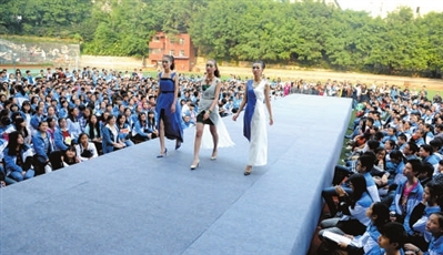 昨日,重庆铁路中学学生们在T台上展示曹馨予设计的时装。当日,该校16岁的高二女生曹馨予设计的21套时装秀在校园举行,完成了她人生中的首场T台秀。 据新华社
