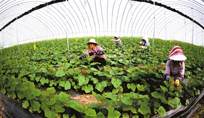 22日,嘉鱼县潘家湾镇四邑村农民在蔬菜示范基地培育水果黄瓜。目前,该县已建成蔬菜示范基地19个,发展蔬菜面积45.9万亩,年总产量超过100万吨。 记者 袁灿 摄