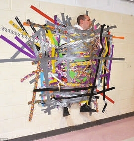 据报道,美国科罗拉多小学校长瑞安愠斯特向学生们承诺,如果他们能为小镇秋天的狂欢节卖出1万张票,他就答应让学生们把他粘在墙上。