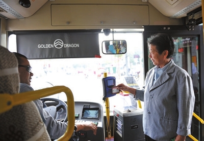 27日,崇阳县城,74岁的张瑞华老人手持老年人优待证免费搭乘公交。今年来,该县交通运输局公交公司已投入20余万元,对全县48台公交车安装IC智能刷卡系统,并为60岁以上老年人和残疾人办理减免优惠卡,此举惠及7万多老人。
