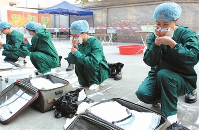 10月30日,在河北张家口埃博拉社区防控演练中,应急队员在着防护服。