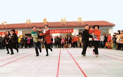 昨日,参赛运动员在参加“一家三口跑”比赛。当日,河北沧州黄骅市举办首届农民趣味运动会,来自全市的500多名农民运动员参加“搬运粮食”“袋鼠跳”“一家三口跑”、“背妻跑”“心心相印”等项目的比赛。 据新华社