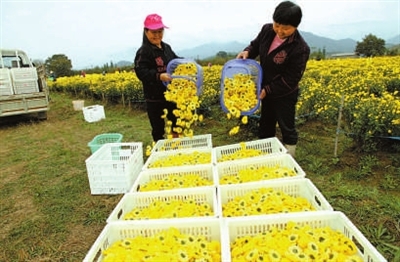 昨日,江西省宜春市靖安县锄山头生态农业专业合作社的农民在采收有机皇菊。
