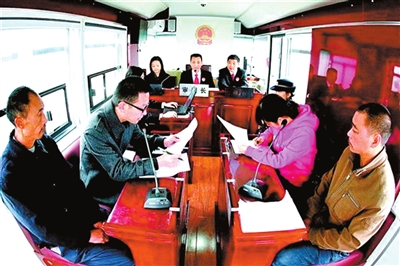 7日,全省法院首辆“车载巡回法庭”在钟祥市洋辛镇蒋滩村开庭审理交通事故案。钟祥市人民法院在全省法院系统率先创建移动车载法庭巡回审判科技庭专用车,形成移动式诉讼服务、巡回审判、法制宣传、执行指挥功能一体的科技巡回法庭,有效方便乡村群众刑事、民事诉讼判决。(本报综合消息)