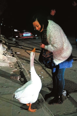 樊城星月社区居民刘先生有只七个月大的白鹅,很通人性,遇见有人与它打招呼说“你好”,它也会回答“你好”。