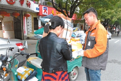 17日,咸宁申通快递员王文杰正在温泉城区派送快件。“双11”过后,全市72家寄递企业迎来寄递旺季,包裹寄递量是平时的3倍。为确保包裹按时寄送到客户手中,各快递公司除了增加快递人员外,还扩大分拣场地规模,增加了寄递车辆。截止目前,没有发生1起邮件快件积压和网络瘫痪现象。 通讯员 胡海淼摄