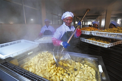 21日,在崇阳县金塘镇,民望豆制品有限公司员工正在炸豆泡。该公司由该镇在外经商人士姜剑新去年回乡创建,总投资1000多万元,购置了国内先进的加工生产线,可生产20余个豆制品种。金塘豆制品在崇阳小有名气,为发展壮大这一绿色产业,该镇通过批放小额贷款、争取税收减免政策等,大力扶持豆制品企业发展。 记者 陈红菊 通讯员 锦忱 黄振摄