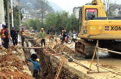 道改造正在紧张施工,预计年底可改造完成。图为施工人员正在安装供水管道。 通讯员 胡佳乐摄
